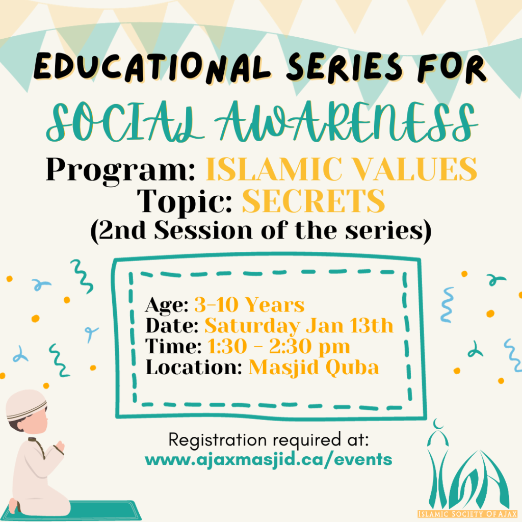The Islamic Society of Ajax is pleased to invite children aged 3 to 10 years to our upcoming session on Islamic Values. This session will focus on the important topic of ‘Secrets’ and is the second session in our series dedicated to social awareness and moral education.