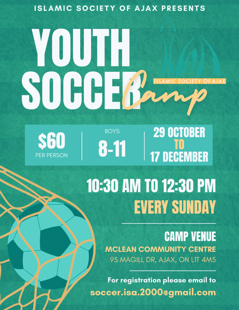 Alhamdulillah, the first session of our youth soccer camp was a great success! We are excited to announce that registration is now open for the second session, which will run every Sunday from October 29th to December 17th, 2023 at Maclean Community Centre.