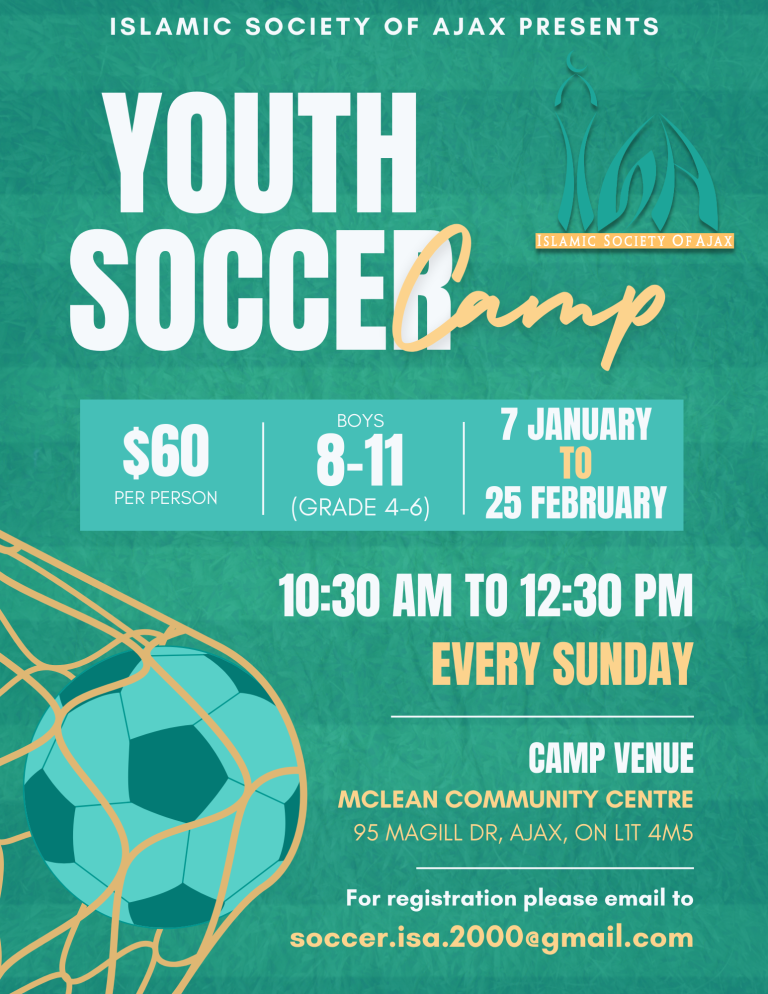 Alhamdulillah, we have had a very successful youth soccer camp so far! We are excited to announce that registration is now open for the third session, which will run every Sunday from January 7, 2024 to February 25, 2024 (total of 8 sessions) at Maclean Community Centre.