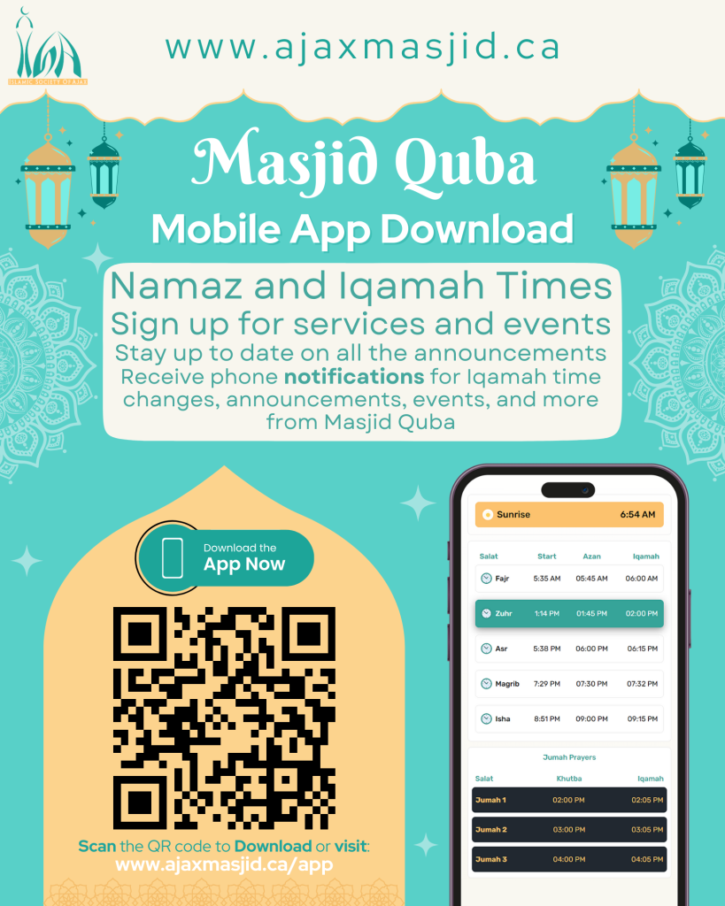 Get prayer times (salah/namaz timings) customized specifically for Ajax,Ontario ensuring you’ll never miss a prayer again. Iqamah times ensure you’ll make it to the masjid on time