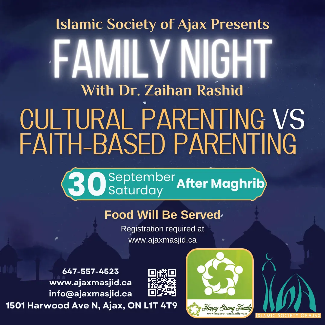 You are warmly invited to our monthly Family Night at Masjid Quba this Saturday, September 30, 2023 after Maghrib Salah. Topic is "Cultural Parenting vs. Faith-Based Parenting."